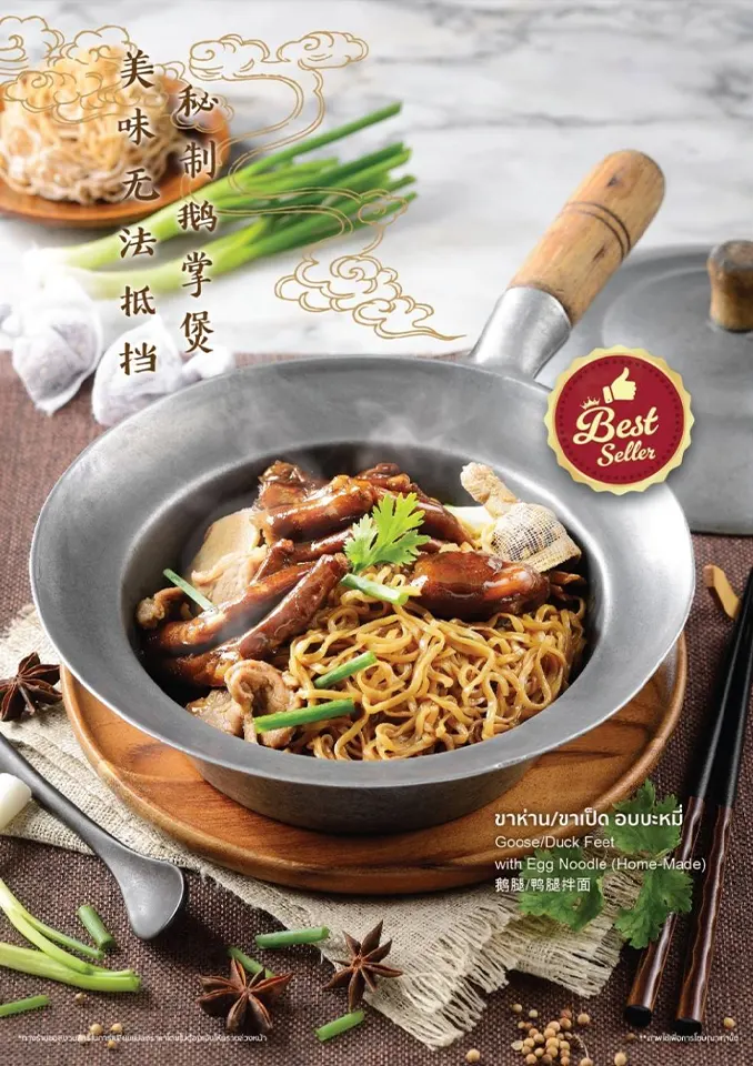 ครื่องเทศ และสมุนไพรจีน ชั้นเลิศคั่วจนหอม ตุ๋นกับขาห่านจนเปื่อย เข้าเนื้อ ละลายในปาก อบกับบะหมี่ไข่โฮมเมดเส้นเล็ก เหนียว นุ่ม